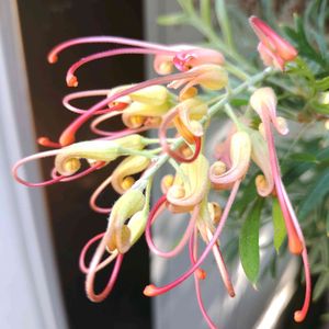 ついについについに、念願の庭のオージープランツのグレビリアのピーチ&クリームの花が咲いたよーーー🤩 もう駄目かと思ってたけど、よかった
