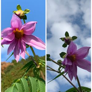今朝、諦めていた皇帝ダリアが開き始めました‼️右は早朝、左は午後です。まだ全開はしていませんが、嬉しくて'upさせていただきました🌸