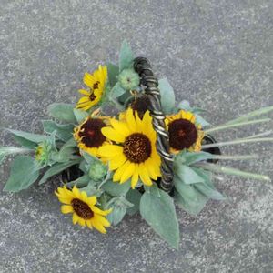 こんにちは☁️ 咲き遅れていた🌻が 今になって連日咲いております🌻 蕾、開花、開花後を 使って活けてみました。 鍼灸院へ届けて来ました🍀🌻🍀