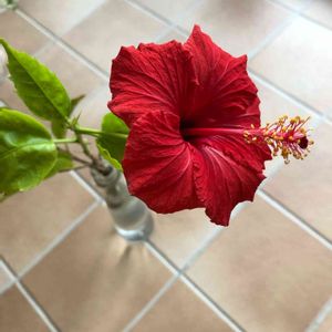 夏の思い出、ハイビスカス一輪 我が家の1番の大きな鉢植え。 数年前の見切り品が植え替えの度に大きな鉢にしたら、年々大きくなり、私と同じくらいの丈に、、、今年冬越しの前にバッサリ✂️半分に。まだ蕾ちゃんがあり、可哀想だから、一輪挿しに。ガラス越しのお日様に向かってパッと咲いてくれました。 ありがとうねー💕