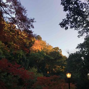 お出かけ先にて。 黄色く染まった木々が、西日を受けて輝いていた。