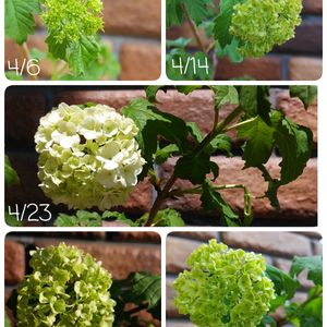 ビバーナム・スノーボール 小さい可愛い花で新緑色から段々白くなってきました🤗🎶 💡アジサイのアナベルに似ていますがまったく違う種類の植物だそうです。 ビバーナム 🌼ガマズミ属の落葉樹で春に花が咲きます。 🍃葉の形はカエデに似てます。 アジサイ 🌼アジサイ属の落葉樹で梅雨時期花が咲きます。 🍃葉の形が楕円でギザギザしています。