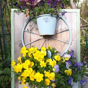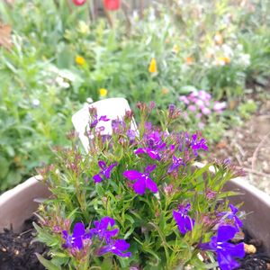 98円のロベニアを楽しむ ロベニアの後ろにはミックスフラワーからの苗が咲いた。
