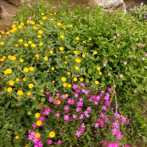 零れ種から咲く、黄、ピンクのカルンジェラ、シレネです。 リンゴの木の根元にもリナリアの零れ種から