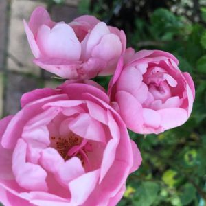 バラ・ハンスゲーネバイン🌹 我が家のバラの中では、ミニバラと同じくらい大株にで、房咲きなので花数も多いバラです✨ 中輪でピンク色のカップ咲きが可愛らしい💓 微香♡