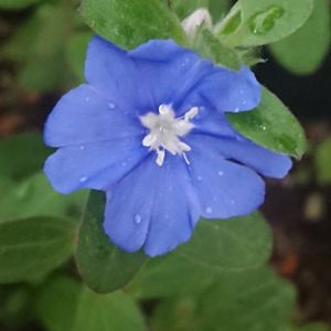 車庫の中に木で四角いキューブ型を組み立て 内外に透明ビニールをホッチキスで止めてドアを付けた ナンチヤッテ温室に入れたアメリカンブルーです。🤗 かわいい花をつけています。🤗🎵➰🎵