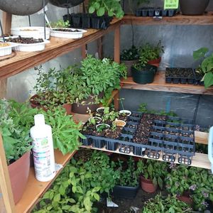 ただ今冬支度、ナンチヤッテ温室はほぼ満室。🤗🎵 アメリカンブルーはちらほら花が付き、サフィニアもつぼみがあります。🤗🎵