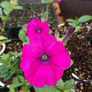 ナンチヤッテ温室の我が家のサフィニアこの品種は元気がいい。🤗🎵➰🎵 一つずつ花芽が育って咲いています。🤗🎵➰🎵 来週には氷点下にはならないと思うので鉢に下ろして見ようと思っています。🤗🎵➰🎵