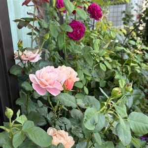 朝 庭に出るのが楽しいです🌹 ① シャルロットペリアン 光沢のある素敵な色🥰蕾も全部開いたら豪華なブーケですね✨ ②奏 花弁がぎゅっとしてます♪ ③京 だいぶ開いてきました。