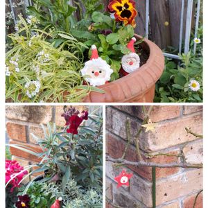 北側玄関前のカラーリーフの鉢植えを クリスマス風に装飾してみました😊 雑貨で飾るのも楽しいなと思いました✨
