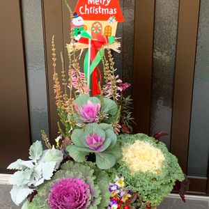 葉牡丹寄せ植え 背の高めのハボタン2本は、 何年目かのほったらかし 葉牡丹です😅 春過ぎそのままほったらかしで クネクネ曲がったりの オドリハボタン風になり 毎年またそれを寄せ植えします。 再利用寄せ植えです☺️