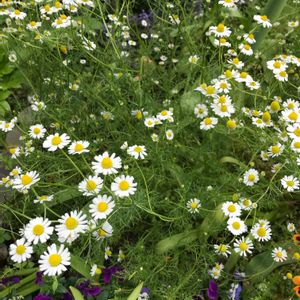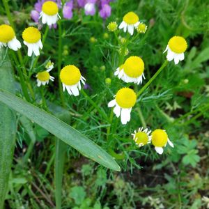 朝のカモマイル 髪をなでつけてる~。 私は植えてません。何年も。 こぼれ種だけで毎年出ます。 適度に残しつつ、生やす。