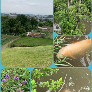 池の土手の上から🤳 今は行けない大阪を眺める⛰🎡🏙 今日の土手の下の方は紫の花盛り🟣 背後は大きな池 こんもりした林のようなところも池 ここにはウシガエルがいて重低音を奏でる。 時々‼️ハイキング客に驚いて、キャー🙀と鳴く(⌒-⌒; ) 雨で水嵩が増し、今日はじめて、ここに鯉がいることを知った。 大きなのが二匹はいる。 良いアングルを探している間に… 鯉のスピードが一瞬速くなり、ひとつの重低音は途中で消えた😨😱