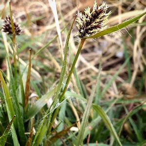 スズメノヤリ (雀の槍) 土手に沢山有りました。イグサ科です。 頭花は、小さな花の集合体。金茶色に見えるのは、雄しべの先の葯(ヤク)です。 名前は、スズメの持つ毛槍の意味。スズメは小さい事の例えで、頭花を大名行列の毛槍に見立てました。 -土曜の土手の日-