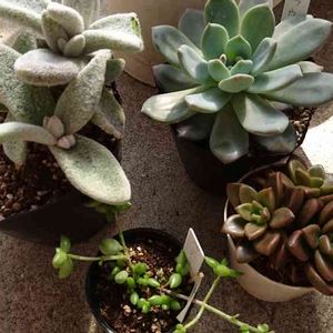 右上のクラッスラピラミダリス、玄関の外に置いていたらナメクジにやられた😭似たような子探してるけどいないかな💦