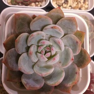 こんにちは🎵🎵 今日は折角お仕事がお休みなのに朝から雨☔️模様で、テンション下がり気味⤵︎⤵︎⤵︎💦 気分を上げる為に我が家の美人さんの登場です💕 【エケベリア ラウリンゼ】🤗 お触り禁止のお粉系さんですね💕💕 お粉系のお世話するのって案外難しい〜〜💦 すぐに指紋がついちゃう〜〜😭💦