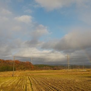 ☔です 虹に出会いました🌈 かすかに分かりますか? 稲刈りの終わった田んぼ!刈り取り後が黄金色!遠くの山の紅葉🍁雲の合間の青空🌈 虹に向かって走ってみました🚗💨💨(´∀`*)ウフフ