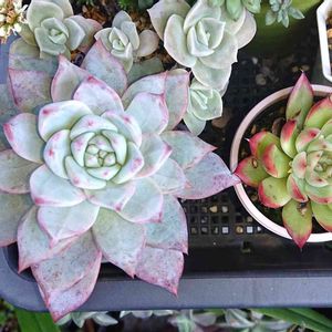 お尻(仙骨骨折)の痛みはだいぶマシになったと思ったけど、やっぱりまだ痛い。 1ヶ月以上経つのにね💦 あれ以来 毎日 牛乳を飲むようになりました🥛 今日は、雨の予報が晴れてました☀️ 昼休みに慌てて 植物ちゃんたちを外に出したけど、時間が足りず、残りは夕方に。 明日も天気いいらしい❗️それ以降はずっと天気悪いみたいなので、明日は貴重な晴れ🤗 今日の写真📷は、また Linaさん ありがとうございます💕💕の巻。 素敵な多肉ちゃんを また いただきました🎁 ↖️左上 エケベリア ブルーバードちゃん(クラッスラにもブルーバードちゃん いるらしい)。 ももちゃん(桃太郎さん)のと一緒に買った もう1個のリメ鉢にイン。 かわいくなるよう頑張って育てまーす❤️ 右上↗️ 1本 違うのが混ざってるのが分かりますか? エンジェルティアーズ錦ちゃん。 涙の滴のような形✨✨ グリネちゃんの鉢に植えました🌱 下⬇️ ミルキーウェイちゃん。 小さい花が咲いてまーす🌼 かわいい。
