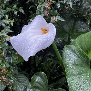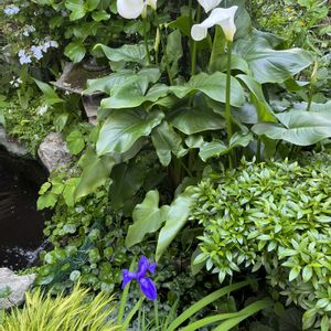 雨の日のカラー 今季はこの花で最後かな? 12本目🎶 後で画像を見返すと、なにか居る様子😳 足場が濡れていて近付けないので分かりません 誰かしら〜?🤭 池に鉢ごと入りっぱなしのカラー そこから増えて飛び出たり、種が落ちて発芽したり💦 ちょっと大所帯になって来ました(笑) 3枚目 右が元の株 左が増えた株 大きさが逆転してきました😅