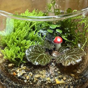 庭から採取の苔で✨️苔テラリウム✨️ 何種類か採りましたが上手く苔が使いこなせず😅 ユキノシタを真ん中に配置してアラ隠し(笑) 作るにあたって調べてた結果、自然に生えていた苔の場合 土や汚れをよく洗い、殺菌剤を使った方が良いそうです それでもカビたりしてしまう事があるとか 私は今回、カビ予防になるヒバオイルの希釈水をスプレーしてみました さて育つでしょうか〜