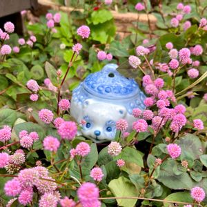 ポリゴナム♡ 小さなお花畑に埋もれて 嬉しそうな 香炉のタヌキさん♪