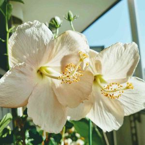 こんにちは👋😃 部外者ですが、令和ランデブー💕 参加、お願いします😃 真っ白なハイビスカス🌺🌺 2つ寄り添って咲きました❣️
