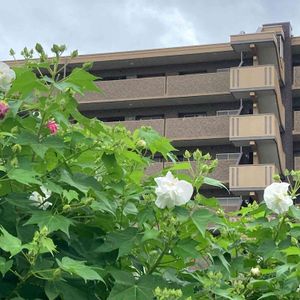 2021.8.14 大雨でJR奈良線が運転見合わせのため今日もジムを休みました。この時間降っていないのですが😥 酔芙蓉です。ひるまえですが、ピンクになったもの、白いもの。右側の白い酔芙蓉は縁が少し赤くなってきています。