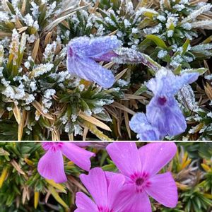 朝🐕散歩 シバザクラ(この時期なのに?) と教えて頂きましたー 下は12月10日撮影 今朝は最低気温−4.4° 寒い😵 霜がはって 日陰は真っ白でした〜