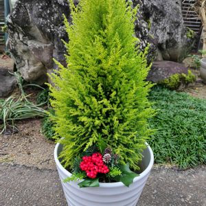 クリスマス寄せ植えやってみました✨🎄✨ コニファーは元々家にいた子は大きいので30センチくらいの子を購入して、家にいたポインセチアとプリンセチアで、シンプルな赤と緑のクリスマスカラーでやってみました😄 バランスはどうでしょうか?🤔 初チャレンジで右も左もわからない状態なので、アドバイスもらえると嬉しいです🙇⤵️