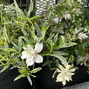 斑入姫梔子 ひとまわり大きな鉢に 植え替えしました。 苗木を買ってきた時は 10この蕾がついていたけど 植え替えしたら ひとつしか咲かなかったから 来季には、いっぱい咲くといいな♬