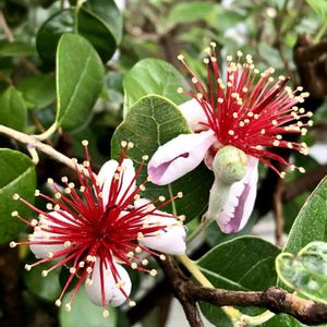 フェイジョア ちょっと前まで蕾だったので😆少し油断しました🙀 昨日見たらもう満開に咲いてました🥰 何本もフェイジョアの木はありますが、実は見た事ないんです。何故かな〜🤔