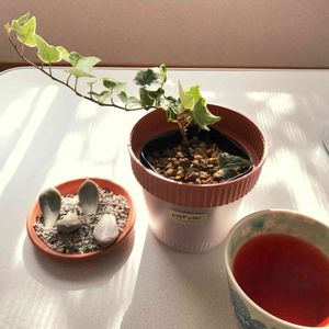おはよーございます(^o^)/ 昨日ご近所のママ友ちゃんが、最近私が凄い勢いで植物にハマっているのを知っているので、ご実家の植物を分けて持ってきてくれました😆🎶 斑入りのアイビーと名前が分からない多肉ちゃんの葉と子宝草の鉢❣️ アイビーはこの間HCで買うか迷って辞めたトコだったからめっちゃ嬉しい😁 多肉ちゃんは、凄いぷっくりしてて、グレーがかった色で…なんだろう…🤔 エケなのか?…それすら初心者すぎて分からない😓 子宝草はワサワサだったので玄関待機😅 小さいお子が葉挿しの近くに植えてあるのが見えるでしょうか?(笑) 最近お気に入りのルイボスティーを飲みながら、お仕事行く前の休憩タイムです😊 いいお天気だから、もっとお洗濯したかったなぁ😅