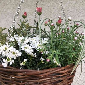 🌸ハンギングバスケット🌸 娘の家の玄関脇用です。 🌸ローダンセマム アプリコットジャム イベリス ブライダルブーケ 花かんざし ☘️ スノードラゴン プリベット シルバー