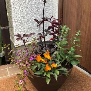 🧡秋の寄せ植え②💛 悩んだ末、桔梗の紫はやめてダリアに変えてみました😅 💛ダリア ブラックナイト ❤️アカバセンニチコウ レッドフラッシュ 💚ダンギク 💜コムラサキシキブ 🧡トウガラシ 観賞用