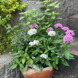 💚寄せ植え💜 昨日2つ寄せ植えをupしましたが、三つ目がこちら😊 大好きなペンタスの寄せ植えです(*^^*) 💜🤍💗でスッキリ寄せました。 斑入りのロニセラ ニティダは3月に寄せ植えに使ったものです。🏷⸒⸒には樹高1mと書いてありますがほとんど伸びてなくて使いやすいです🤗