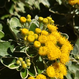 【12月16日】今日のお花 🍀🟡イソギク🟡🍀 ①白い縁取りの葉っぱが素敵です。 ②花のアップです。黄色い小さな丸い花をまとめて咲かせます。 菊人形などに利用されます。 主な見所:花 10〜12月 2022.11/25 撮影