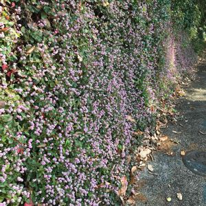 海側へ降りて行く道沿いに ヒメツルソバのピンク色の壁が続いていました😃💕 右側が道路です この辺りは、背景に箱根山があり海からの風があたります 雲が発生しやすいので湿度が保たれているのかもしれません 🍊ミカン園が沢山あります 陽がよく当たり、温暖な地域です