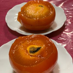 渋柿のデザート😋 焼酎漬け、すご〜ぃ鮮やかなオレンジ色🧡 皮まで柔らかく、 冷やして夕飯のデザート😊