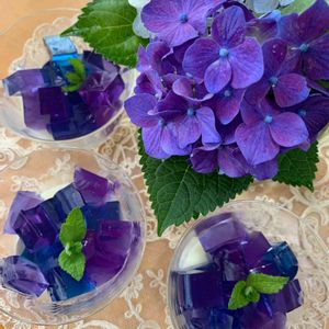 バタフライピーで作ったゼリー💜 *green*さんのpicが素敵だったので、マネして作ってみました。アジサイの季節にピッタリのデザートです。昨日初めて作り、お友だちへのお土産にしました。今日は自分のために💙
