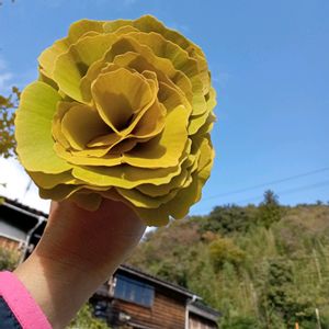 今度はイチョウの葉で バラ作って見ました。 青空に映えます。