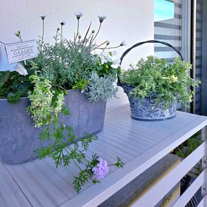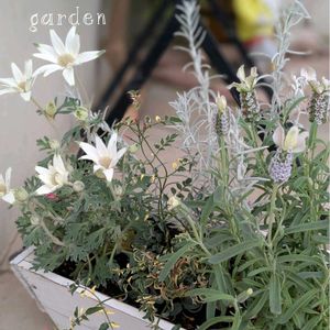 ❁⃘* 白の寄せ植え𓂃𓈒❁︎ ❁︎フランネルフラワー (エンジェルスター) ヘリクリサムコルマ🌿.∘ ❁︎ラベンダー (クリスタルフィン) ハゴロモジャスミン (ミルキーウェイ)🌿.∘ wood·白のプランター 2️⃣3️⃣はアップで♡ 背丈高めでまとめて 風に揺らいでる姿が 優しげ𓂃♪