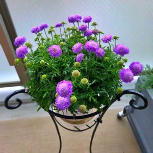 朝から雨でしたが、わずかな晴れ間に、梅雨に備えて下葉を整理しました。 軒下避難中のセントーレア。花が咲き始めていました。