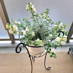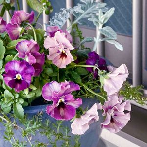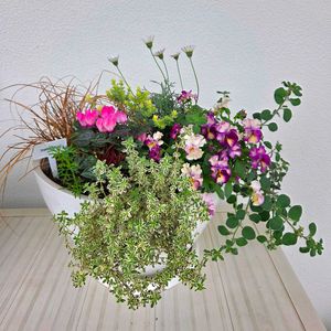 ルーフバルコニー に置いてある寄せ植え2鉢。雪予報の為、ベランダに連れてきています。 春に備えて成長中。寒さの中僅かに咲く花はとても深い色です。 1枚目 / ペラルゴニウム2種、ロータス 2枚目 / スガビオサ、アリッサム