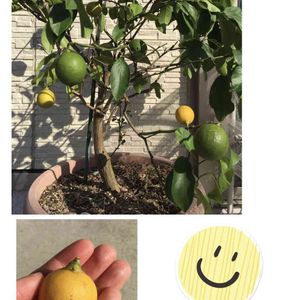 いくつか実をつけたレモン🍋 一つだけキンカンみたい🤣 小さいけど黄色く色付いたので収穫しちゃいました ちゃんとレモンのいい香り〜