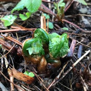 北の山菜畠から。 コゴミがあちこちから顔を出してます。 花は咲きませんが胞子でふえるのか、年々広がってきて嬉しいです。 クセがなく食感が良いので万人受けの山菜だとおもいます。