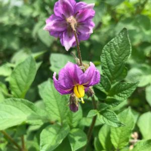 ジャガイモの花です。 3種類植えてます、これはインカのめざめ、かな? 花や実に栄養とられると地下が太れないので、かわいそうだけど、蕾のうちにつんじゃいます。 ごめんねごめんね〜〜