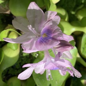 ホテイアオイの花が咲きました❣️ かわいい淡い花色🥰 ラッキーのちょい調べ👀👇 ミズアオイ科 ホテイアオイ属 金魚やメダカの水槽に浮かべて水草として楽しむことが多いホテイアオイ(布袋葵)は、ミズアオイ科の非耐寒性多年草です。ホテイアオイは熱帯地域の南アメリカ原産のため寒さには弱いですが、繁殖力旺盛で放っておいてもどんどん増えていきます。熱帯の国々では、水路などで繁殖しすぎて問題になっているほど。日当たりが良ければ元気に育つので、初心者にもおすすめの植物です。 **✿︎❀ ❀.(*´▽`*)❀. ❀︎✿︎*