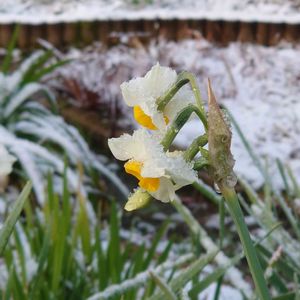 初雪!! 早く開花した水仙もビックリ 寒そう