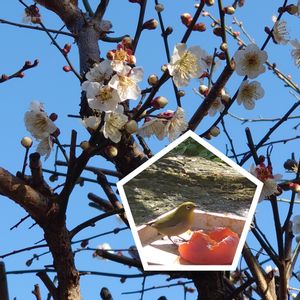 庭の白梅もにぎやかに その下には鳥さんたちが入れ替わり やってきます やはりメジロさんが一番絵になりますね✨