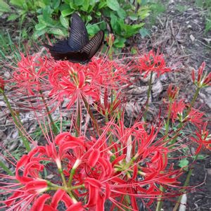 今日のお花 彼岸花 お彼岸ですね。 我が家の庭の彼岸花も咲きました。黒揚羽が来て密を吸っていました❤️🦋